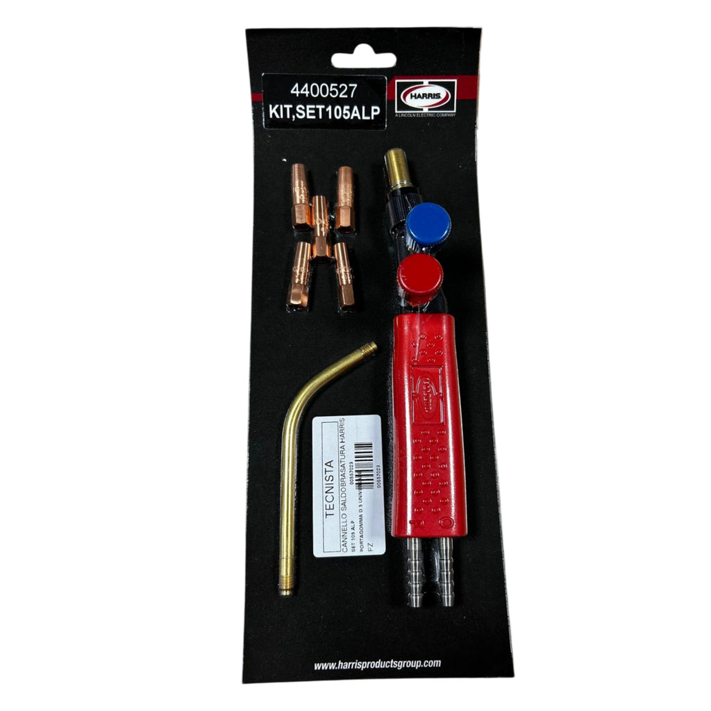 Kit professionale Harris SET 105ALP per saldatura e brasatura ossiacetilenica, composto da 4 componenti ad alte prestazioni. Gestisce portate da 30 a 275 l/h con compatibilità totale verso gas combustibili alternativi: propano, metano e idrogeno. L'impugnatura 105ALP combina versatilità e comfort estremo grazie al design ergonomico in gomma, che fornisce isolamento termico superiore e consente la regolazione del gas con controllo monouso. Punte intercambiabili permettono transizioni rapide tra diversi combustibili senza compromessi. Struttura compatta e peso ridotto assicurano maneggevolezza ottimale durante lavori prolungati, rendendolo la scelta ideale per saldatori professionisti che esigono affidabilità e flessibilità operativa. Le connessioni per il tubo di ossigeno e gas carburante hanno un diametro di 5 mm.